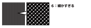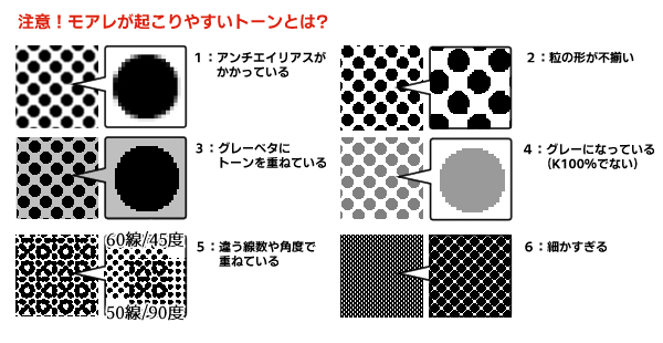 6は80線以上の細かいトーンや濃すぎるトーンなど、粒と粒の間が狭いとトーンが潰れてモアレが出てしまいます。