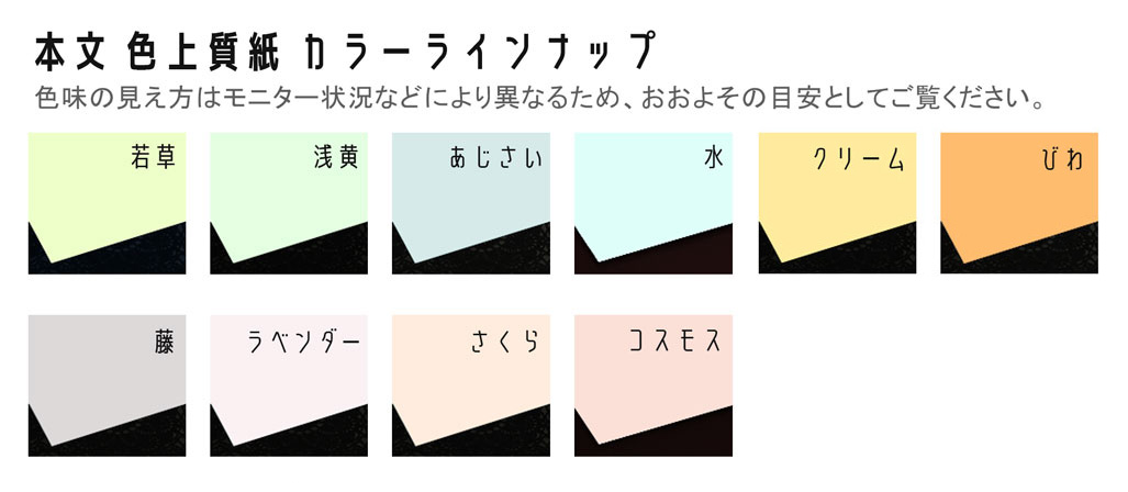 | 本文用紙 | 白系の用紙(4種)・クリーム系の書籍用紙(3種) 追加納期あり:色上質紙(10色) |