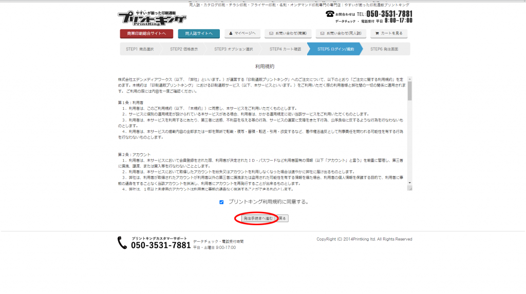 カート確認から注文の発注へ進むと利用規約の画面が出てきますが、