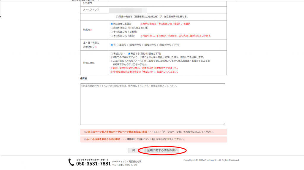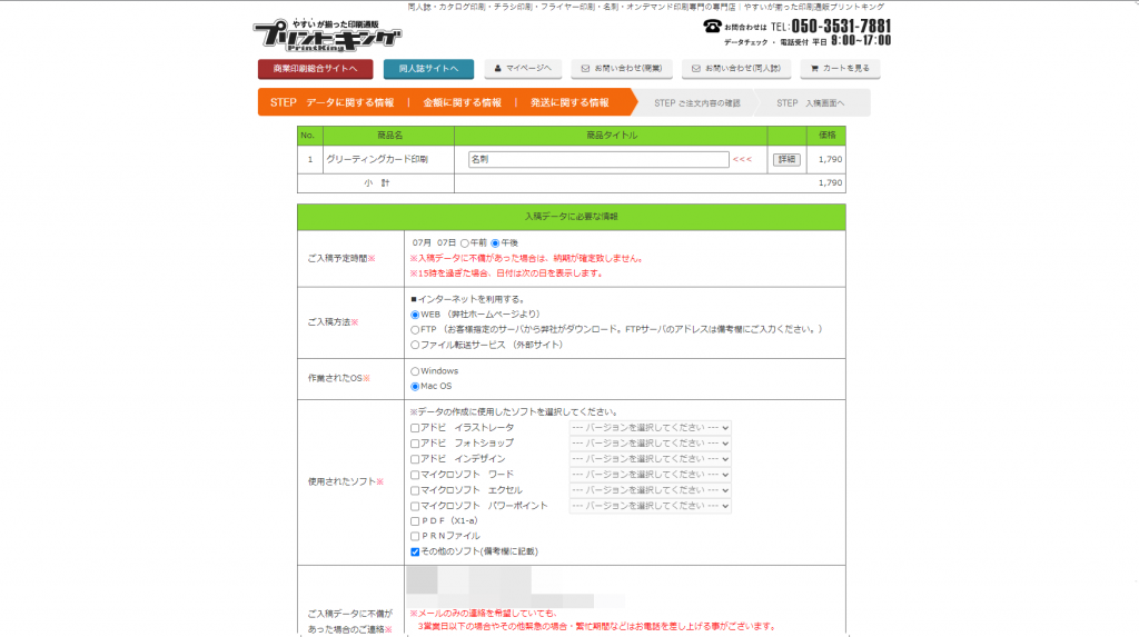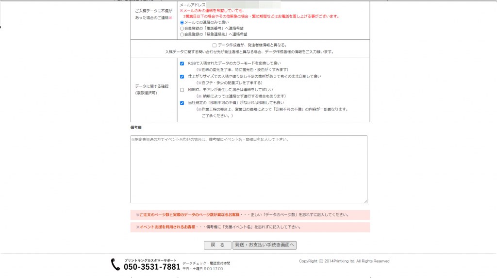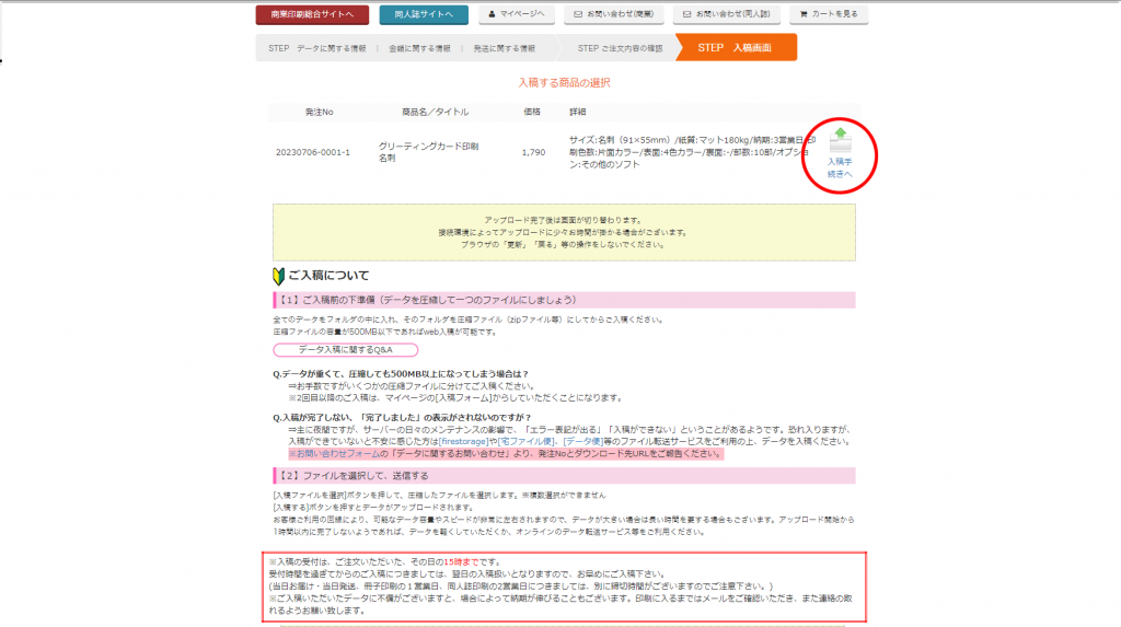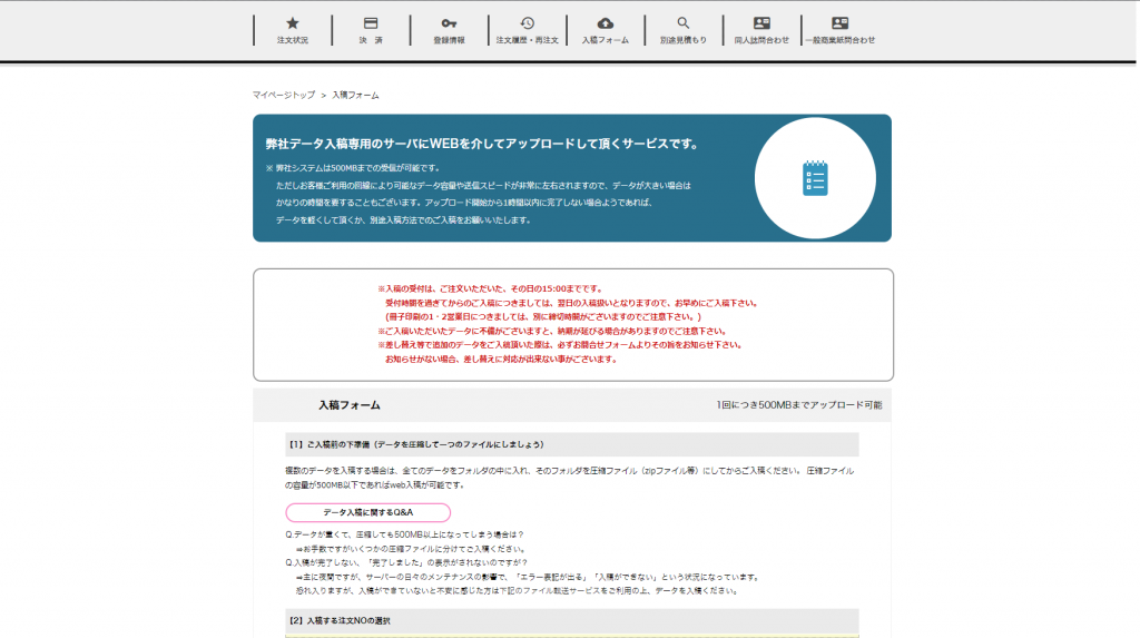 注文確定した後に入稿への案内が出ます。詳細は後で説明しますが、500MB以上のデータや入稿エラーが出た場合はオンラインストレージのご利用をお願いします。