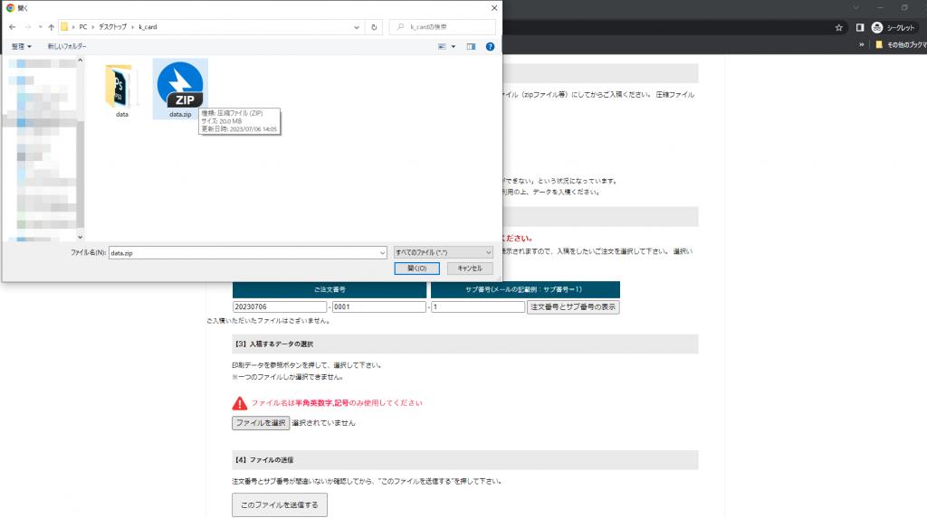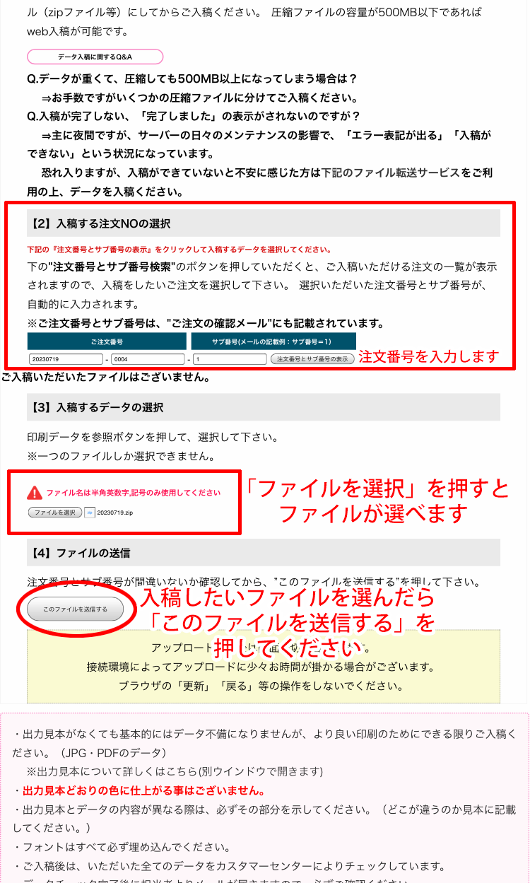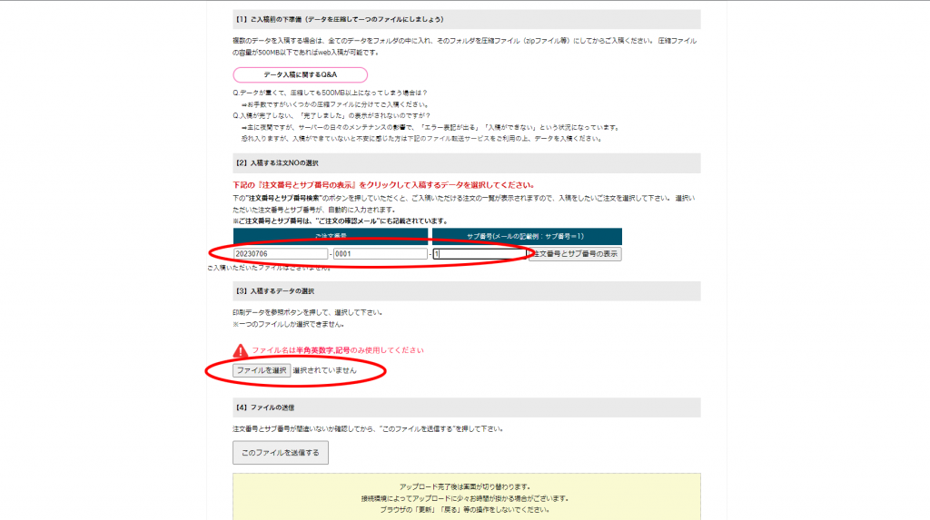 最後に入稿するデータを選択してください(ファイル名は半角英数字、記号のみでお願いします)