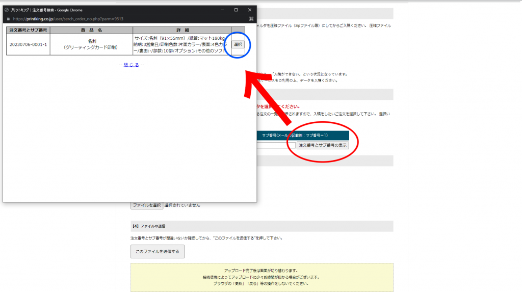 入稿したい注文番号を入力してください「注文番号とサブ番号の表示」から選択できます。