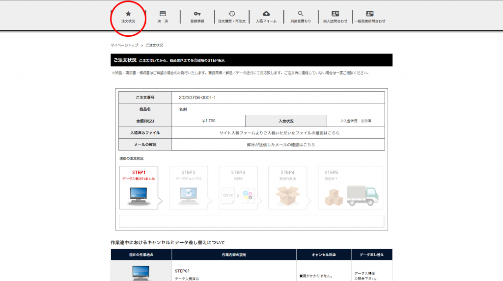 入稿後のご注文状況はマイページ上部の注文状況から確認できます。