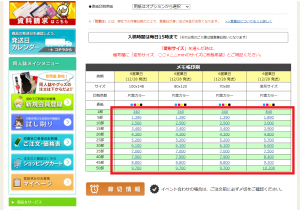 印刷用紙等を選択後、希望する部数と本文枚数から価格を選択