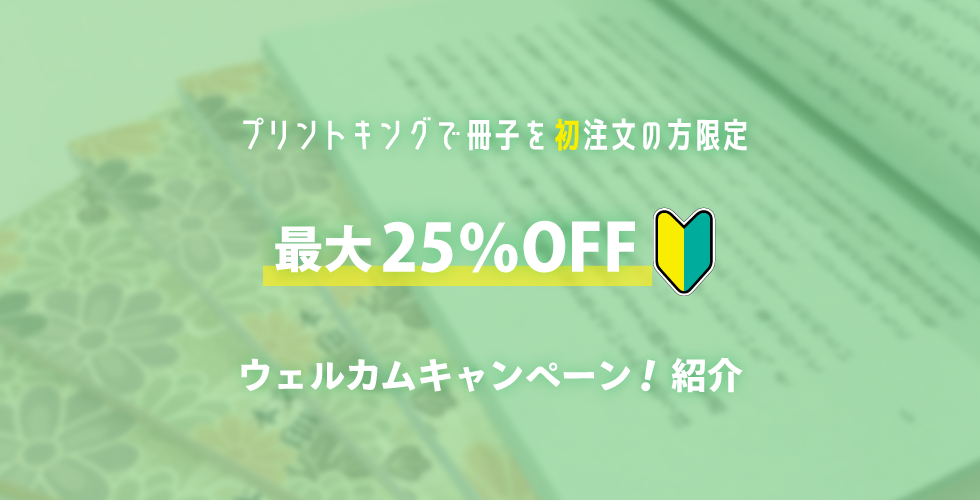 「ウェルカムキャンペーン」は、プリントキングで初めて冊子を注文される方限定で対象商品が最大25%オフになるお得なキャンペーンとなっています!