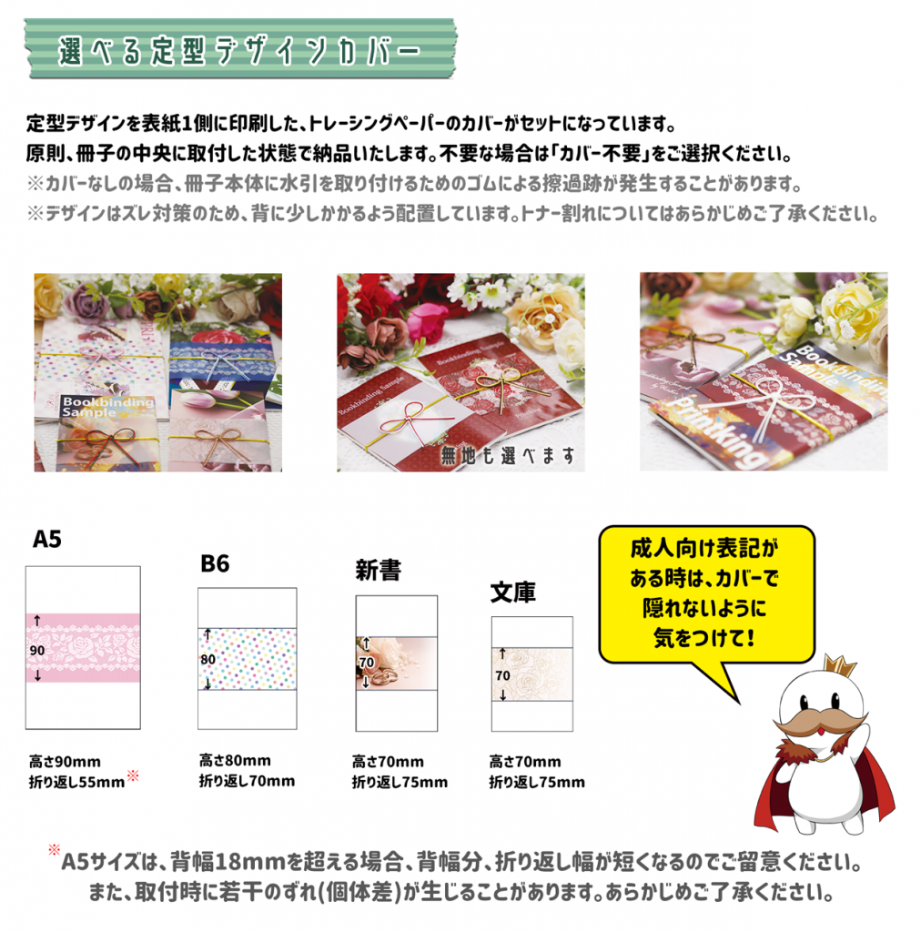 | 選べる定型デザインカバー | 定型デザイン(11種)、用紙:トレーシングペーパー、A5・B6・新書・文庫各種対応サイズ |